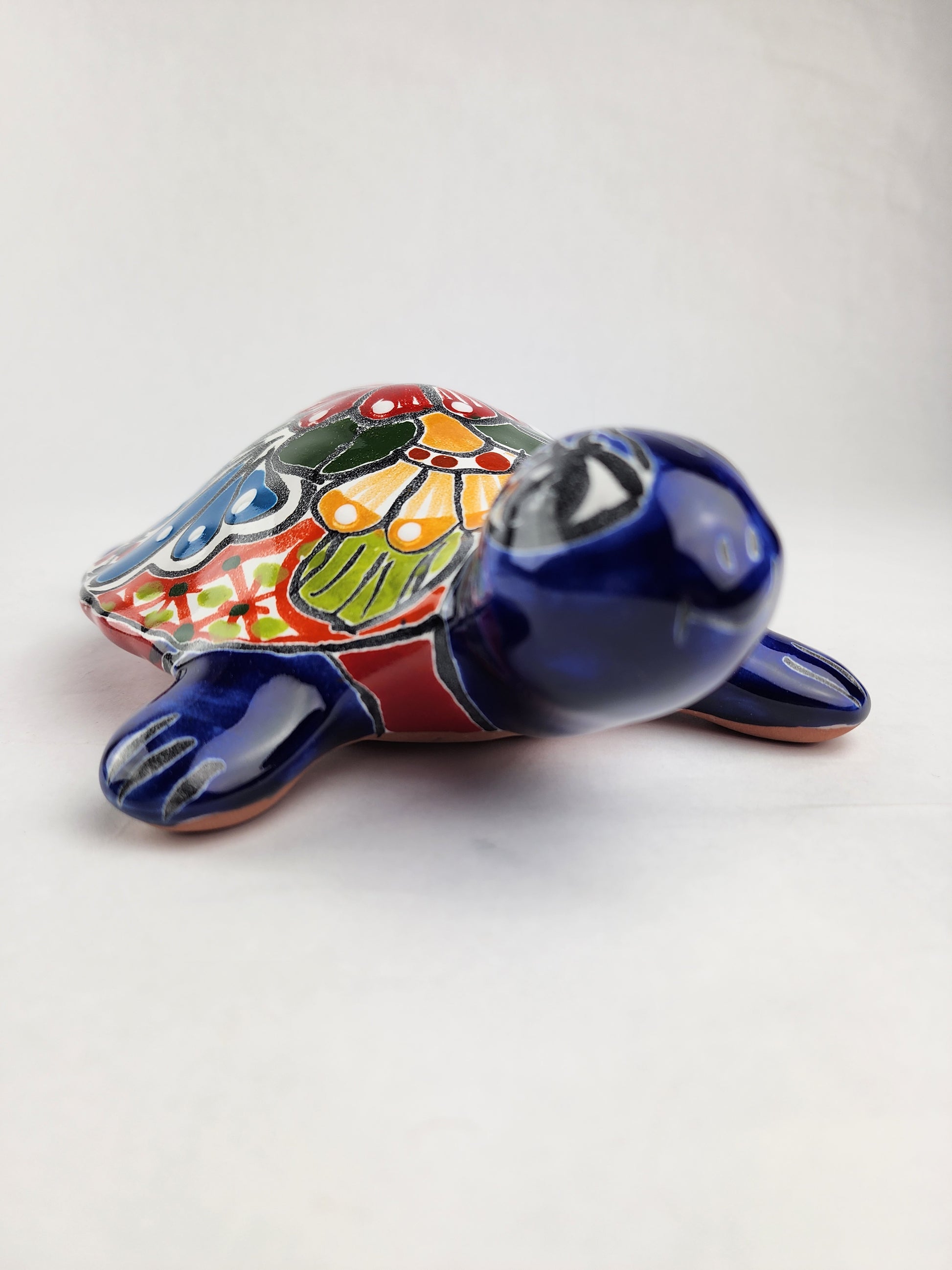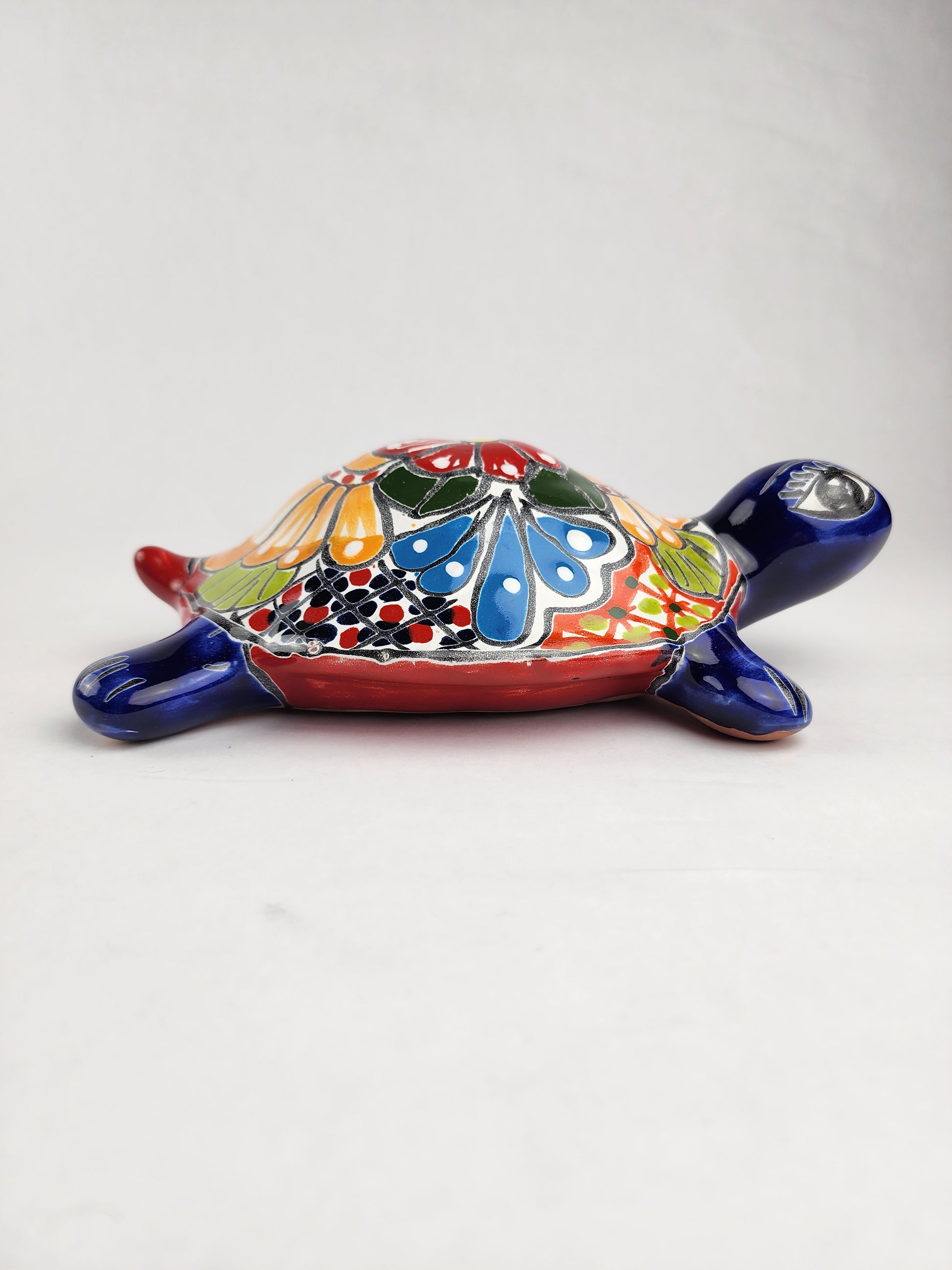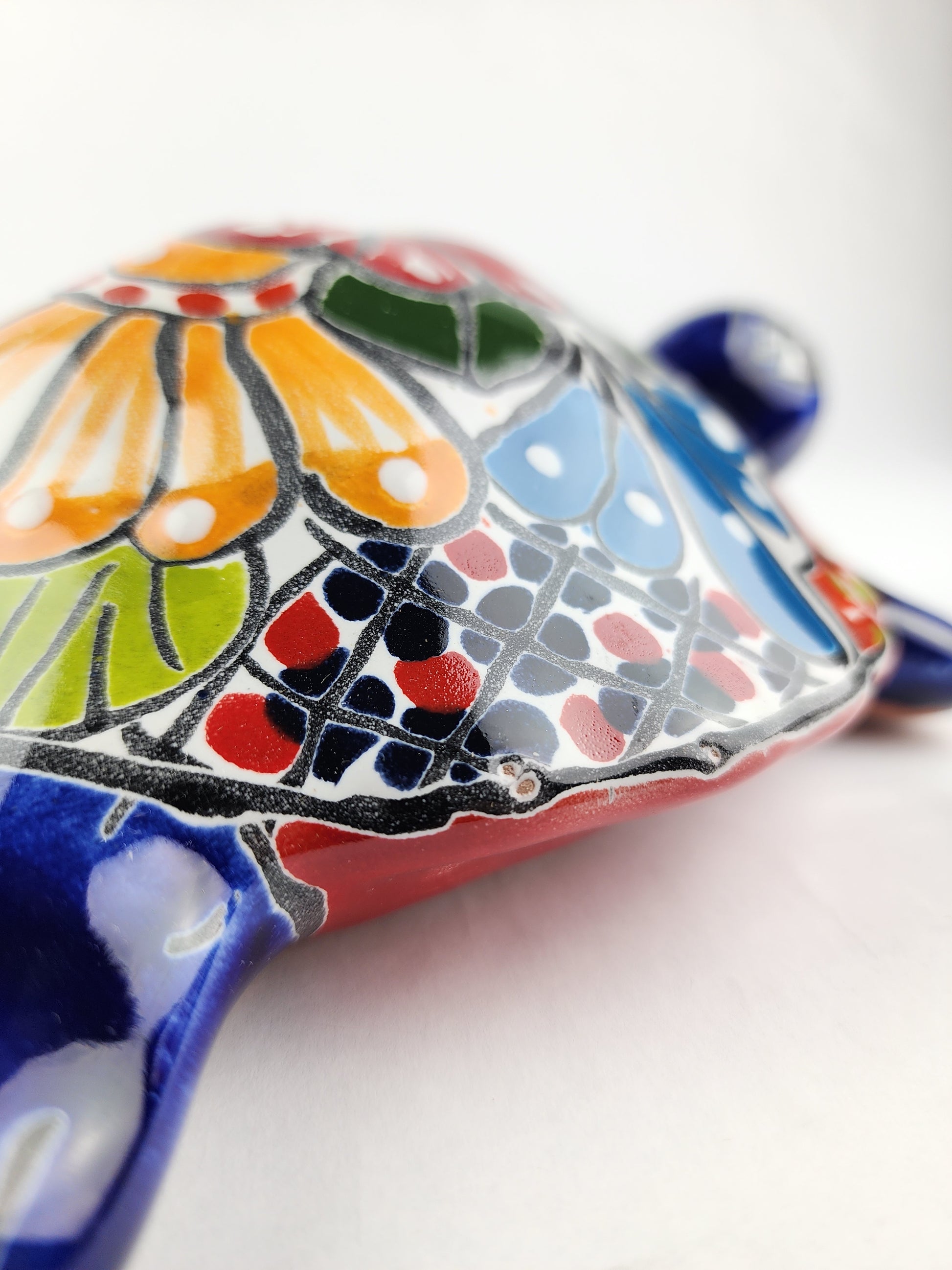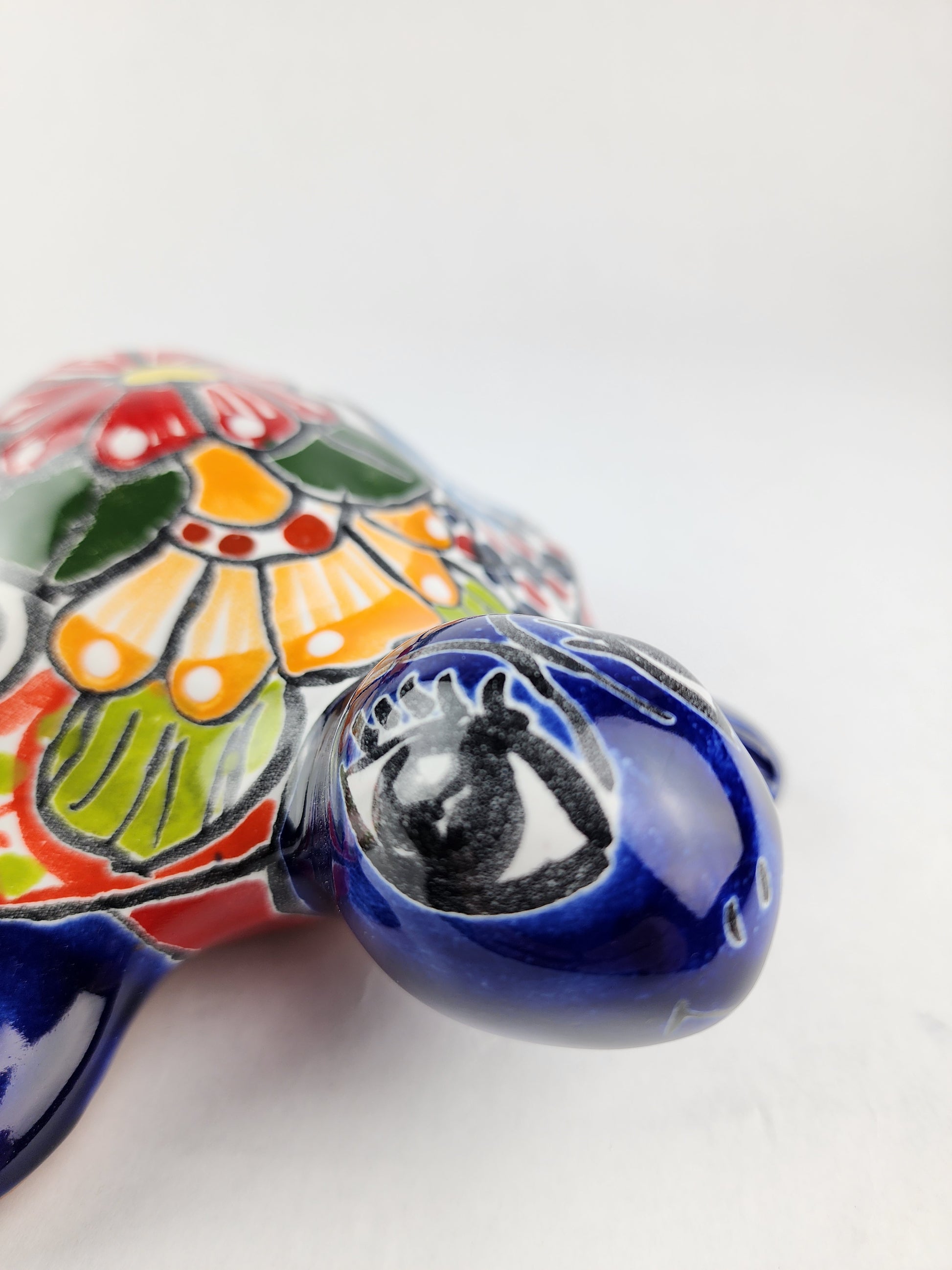 This beautiful ceramic turtle adds a joyful pop of color wherever it goes! Featuring a rich blue shell adorned with hand-painted floral and geometric Talavera motifs, it's a lovely decorative accent for gardens, patios, or indoor nooks.