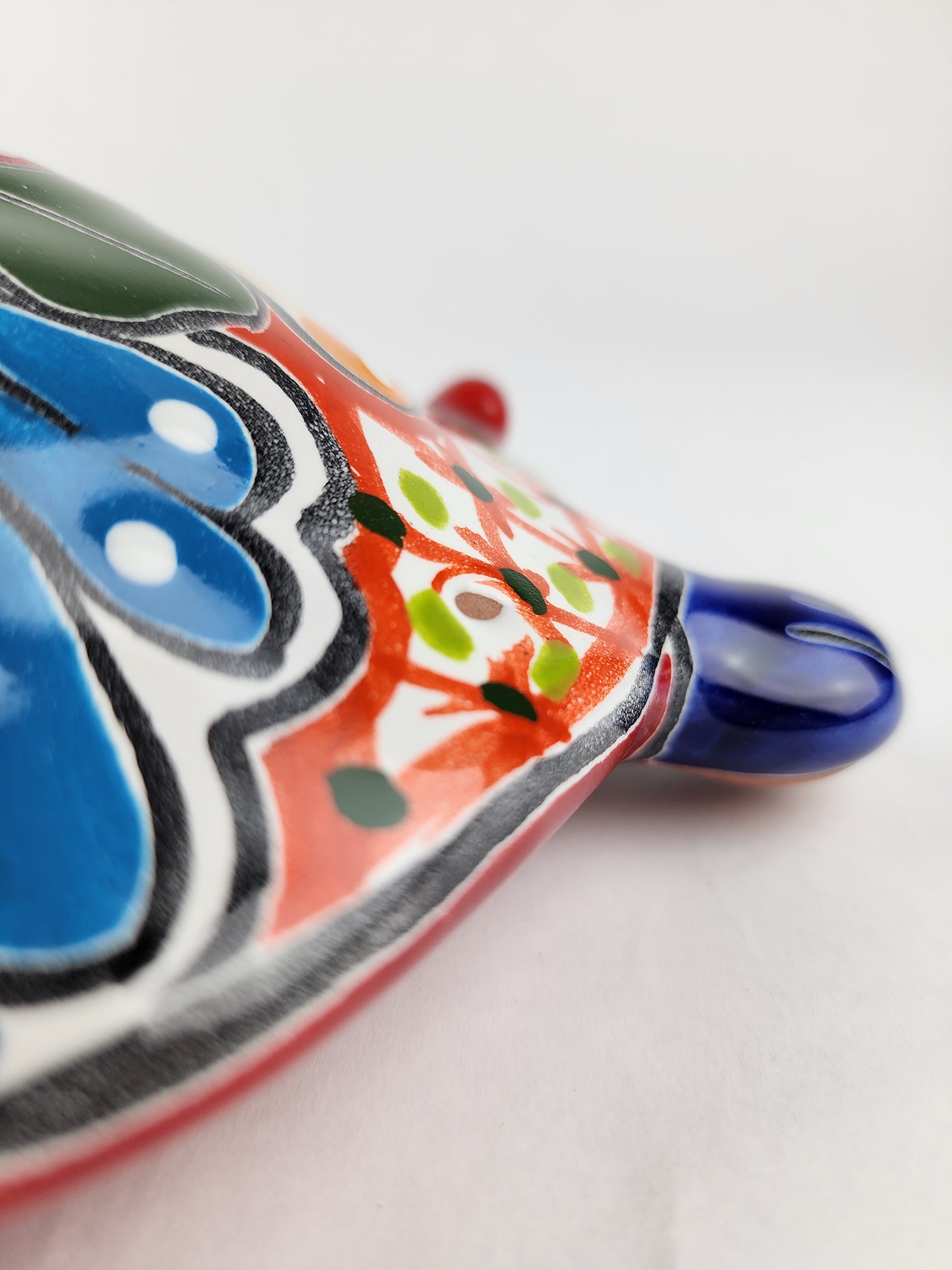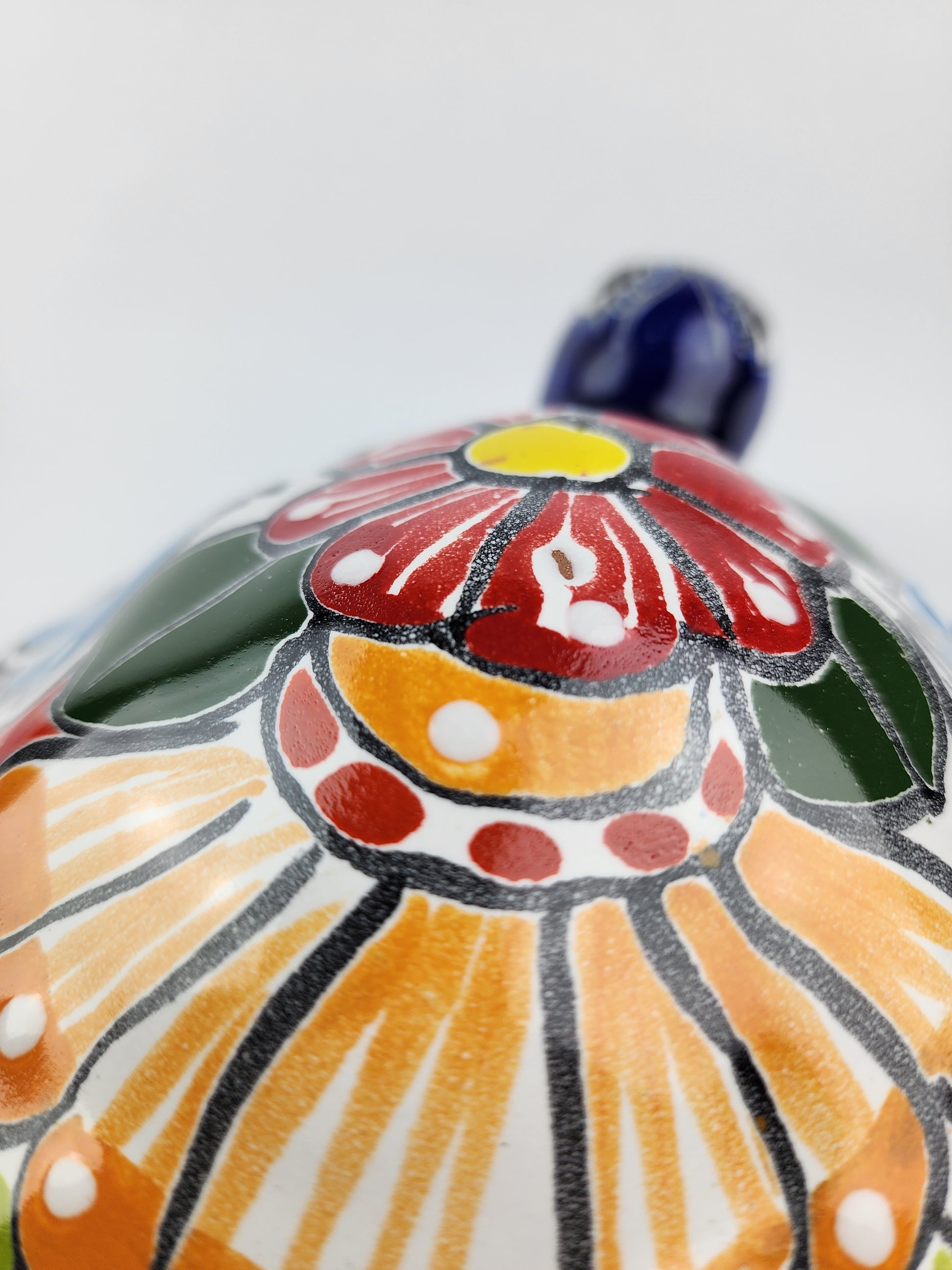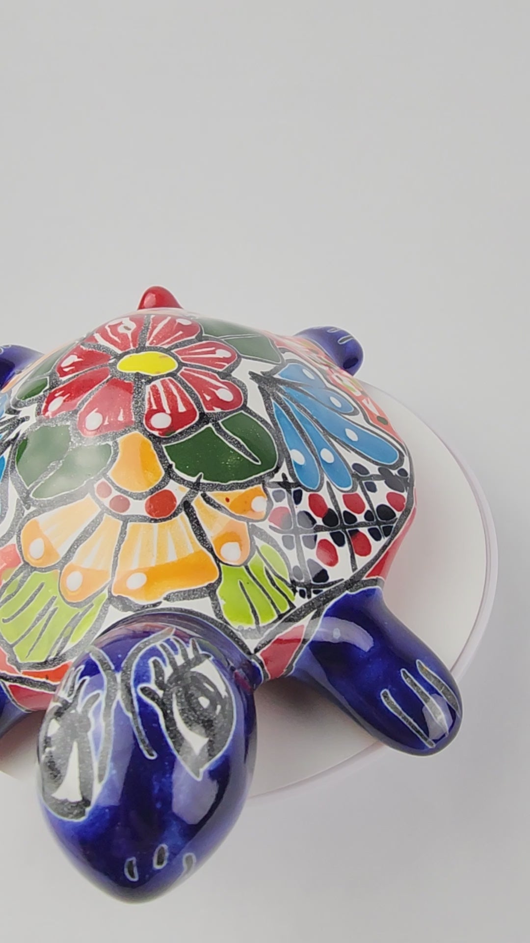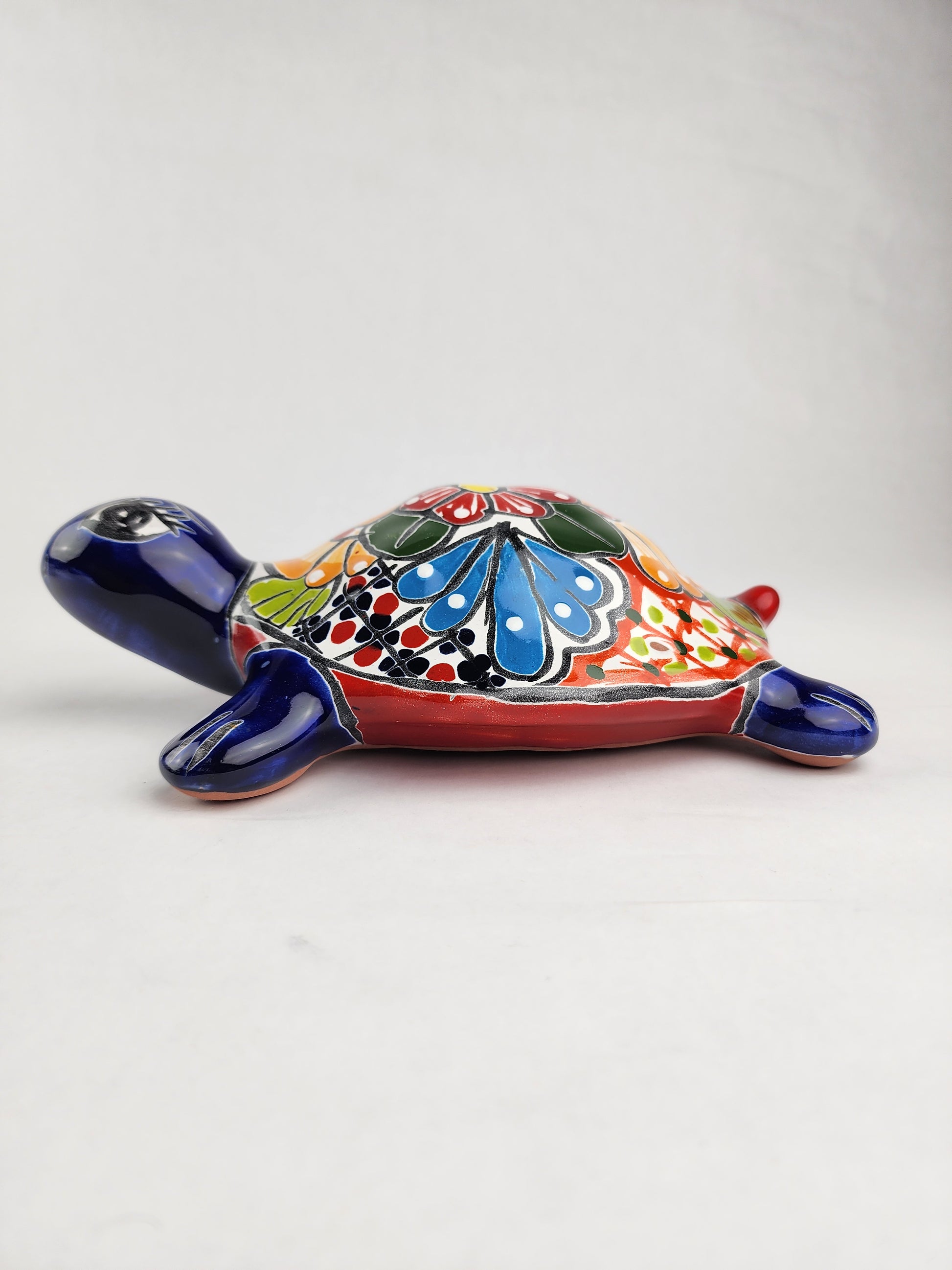 This beautiful ceramic turtle adds a joyful pop of color wherever it goes! Featuring a rich blue shell adorned with hand-painted floral and geometric Talavera motifs, it's a lovely decorative accent for gardens, patios, or indoor nooks.