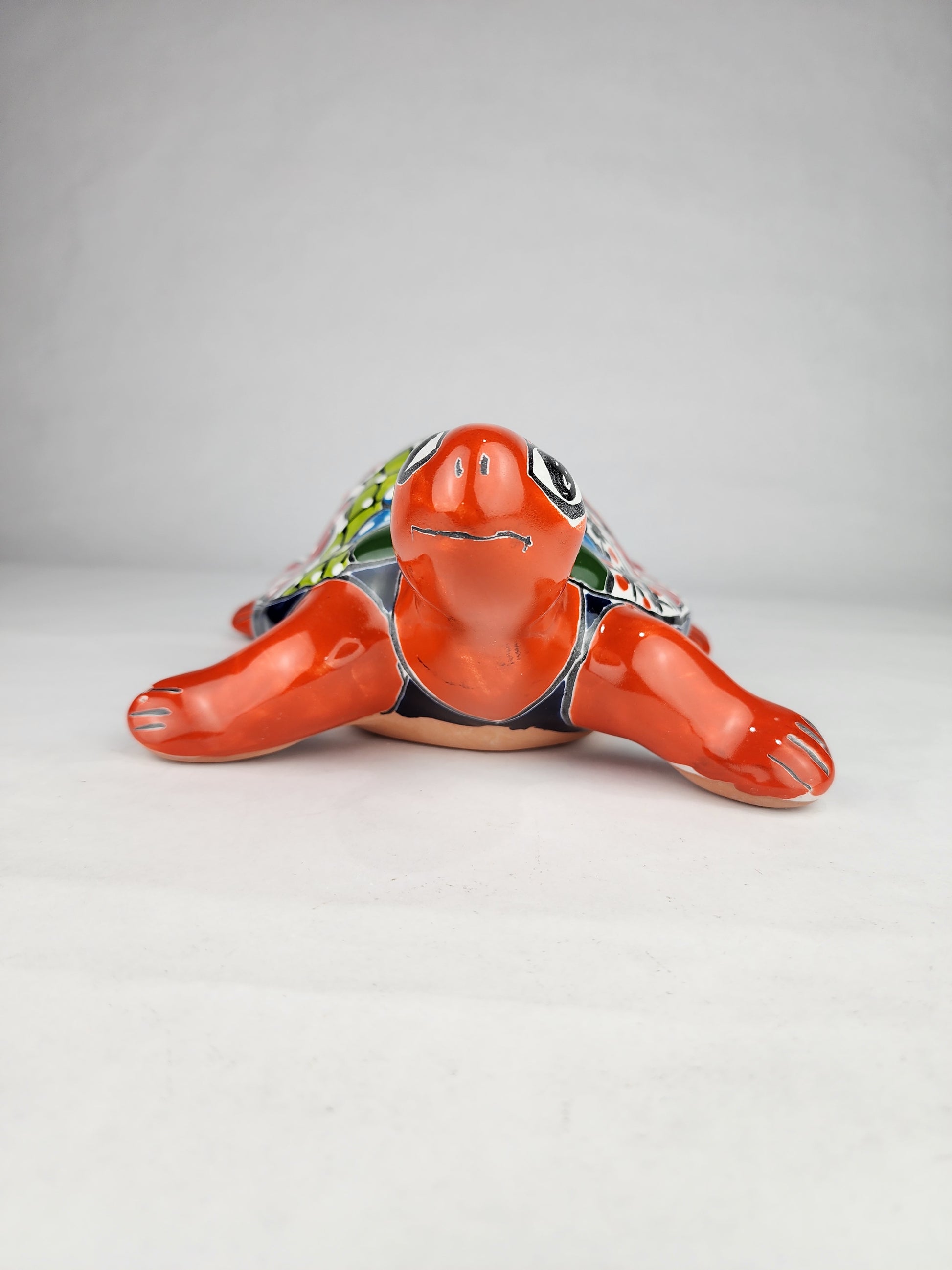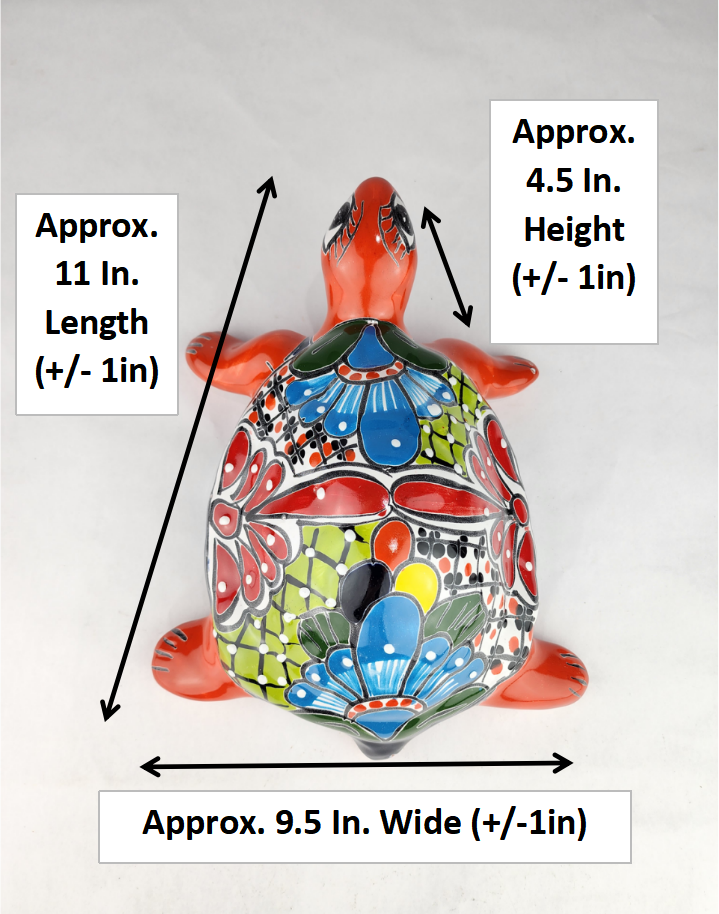Add bold warmth and traditional character to your décor with this Talavera-style ceramic turtle figurine, finished in a rich red-orange body complemented by a highly detailed multicolor shell. Inspired by classic Mexican folk art, this decorative piece features layered floral motifs, bold linework, and a glossy ceramic glaze that enhances each color detail.