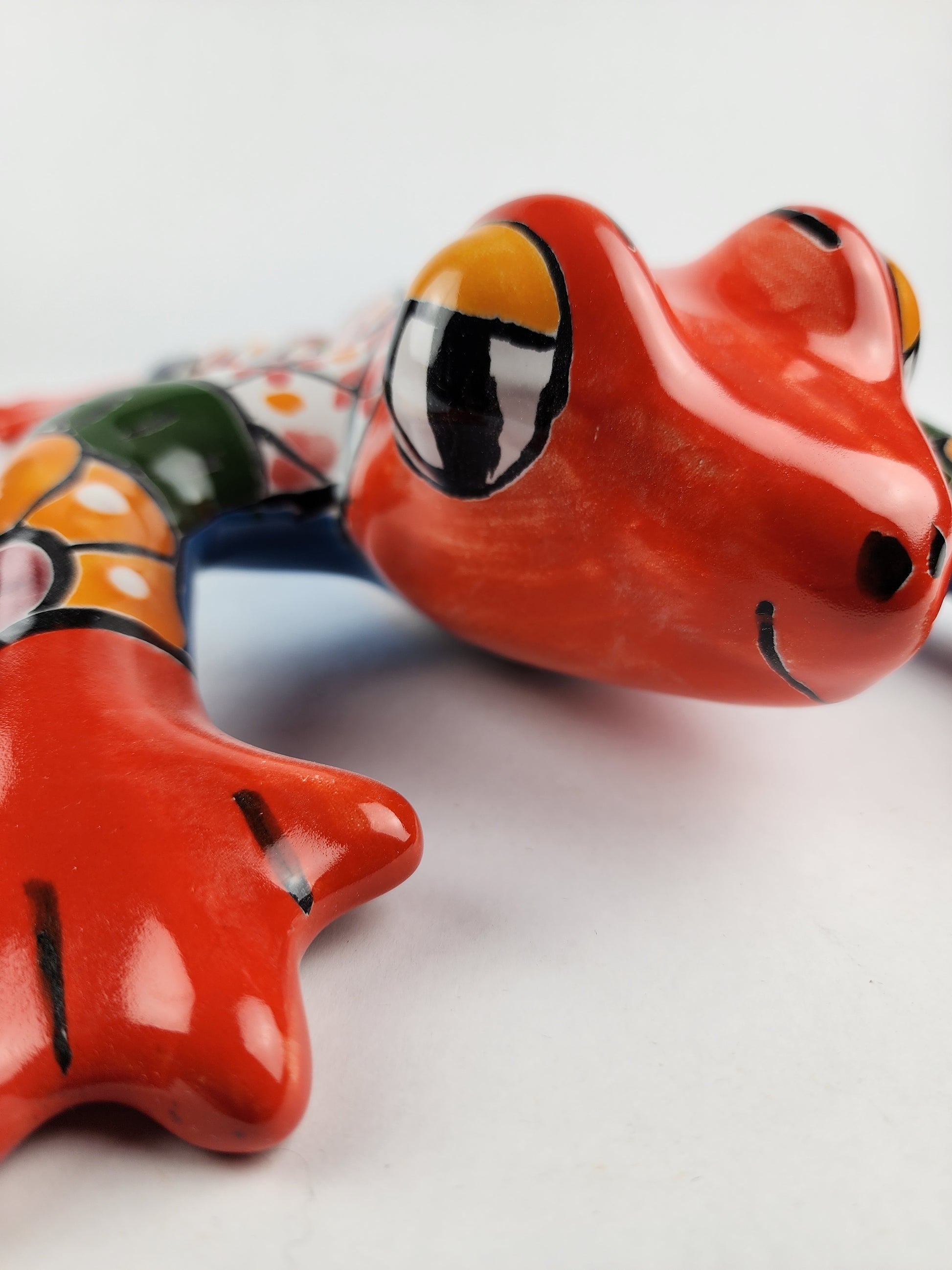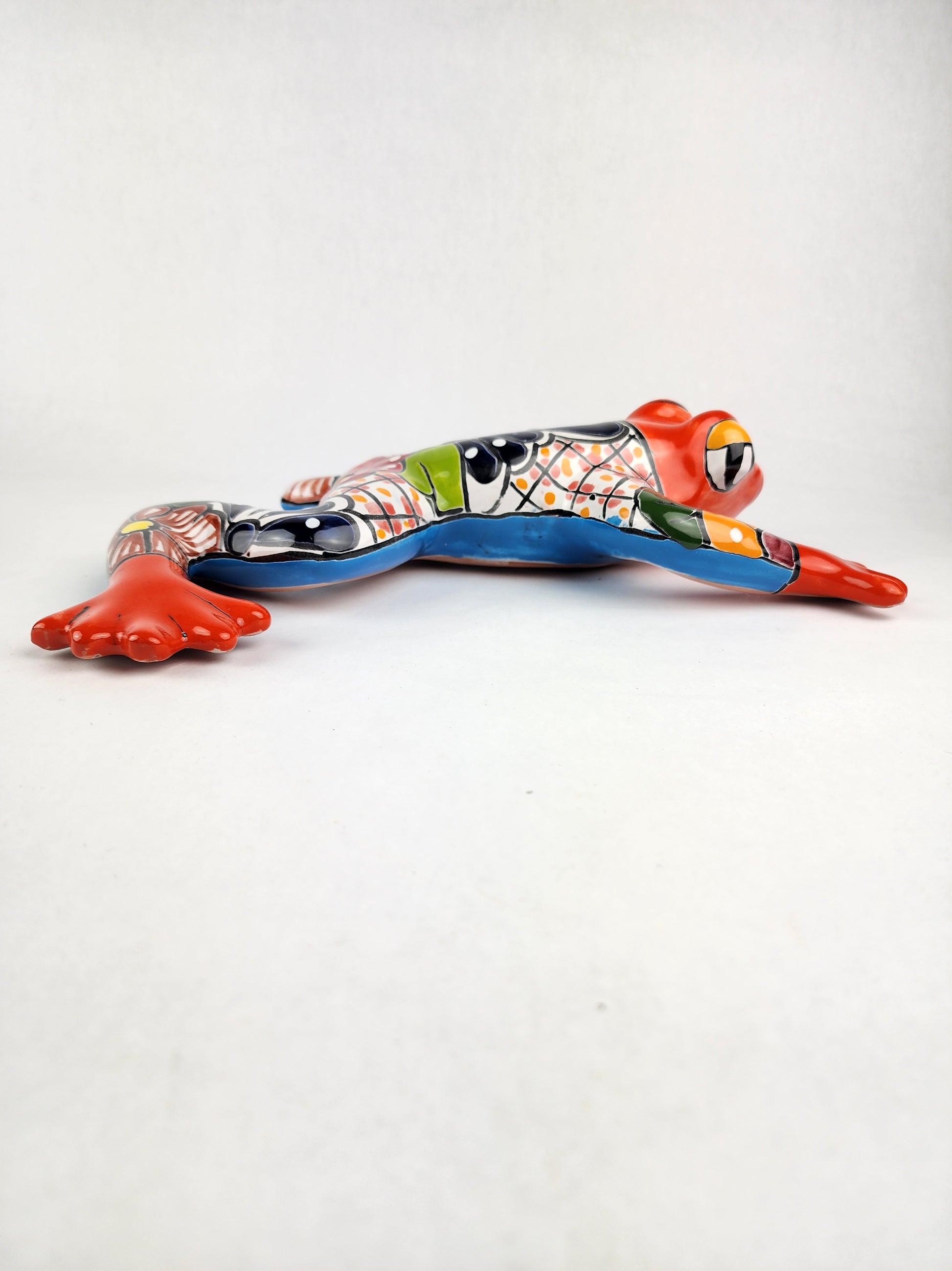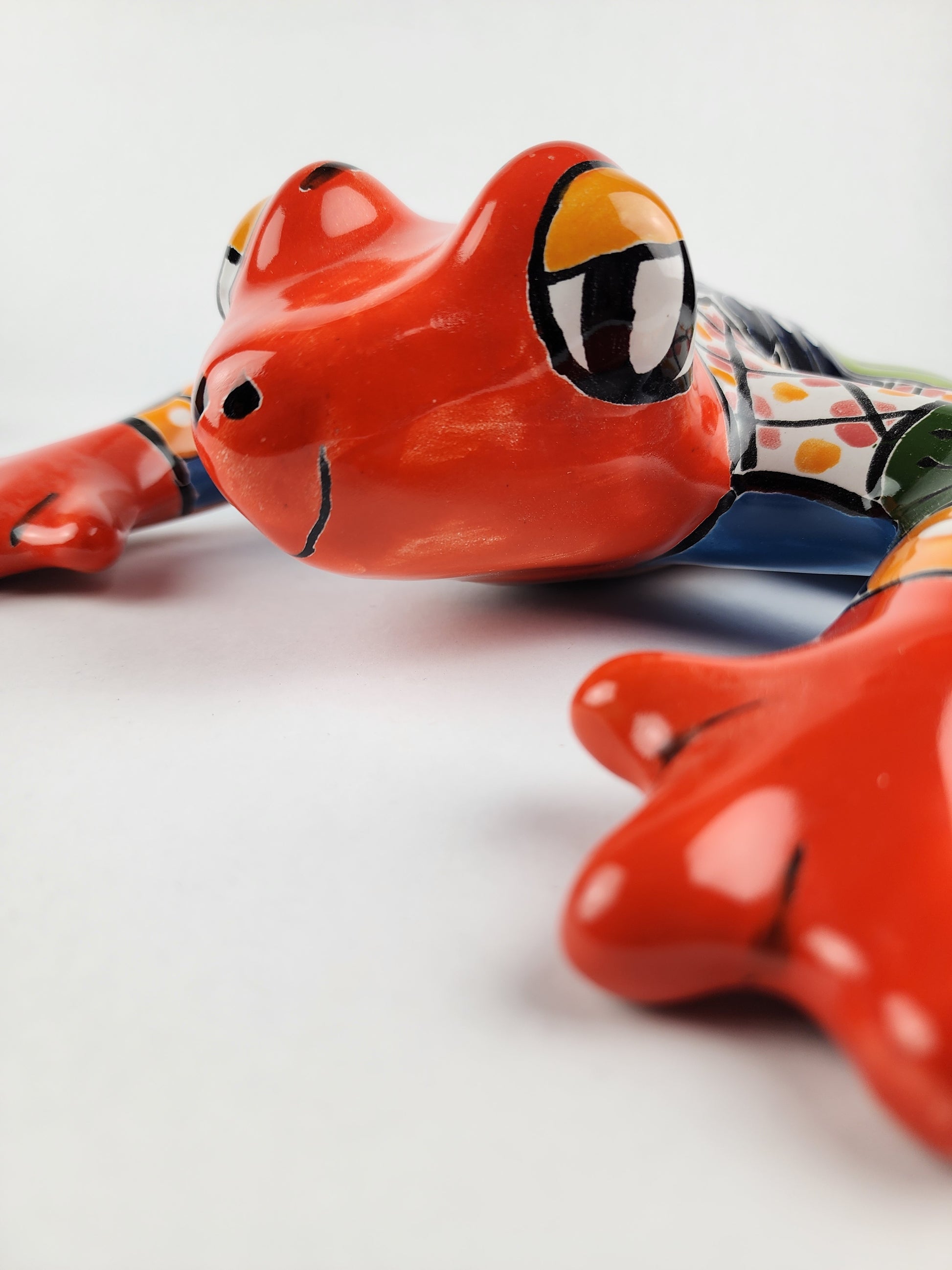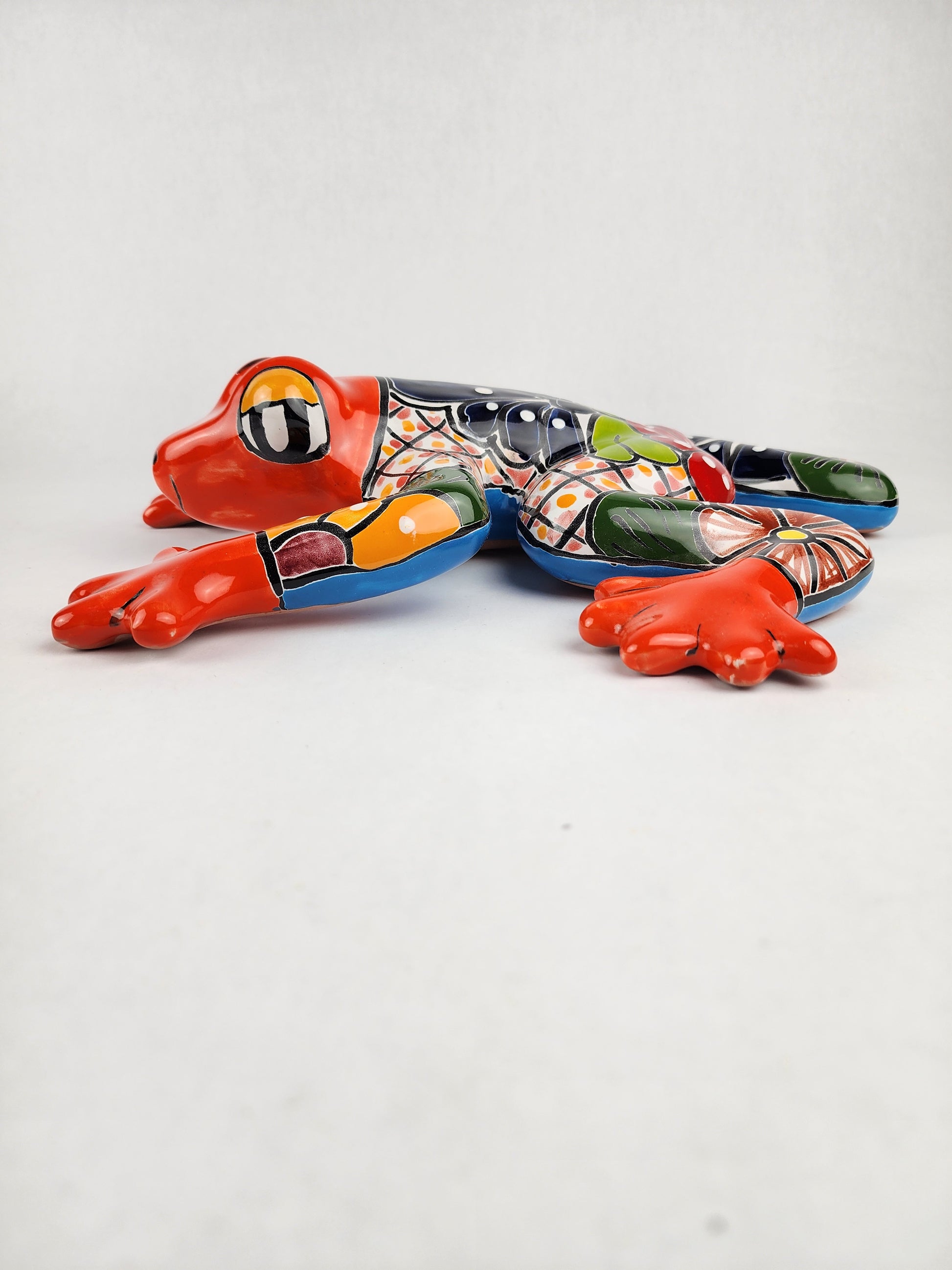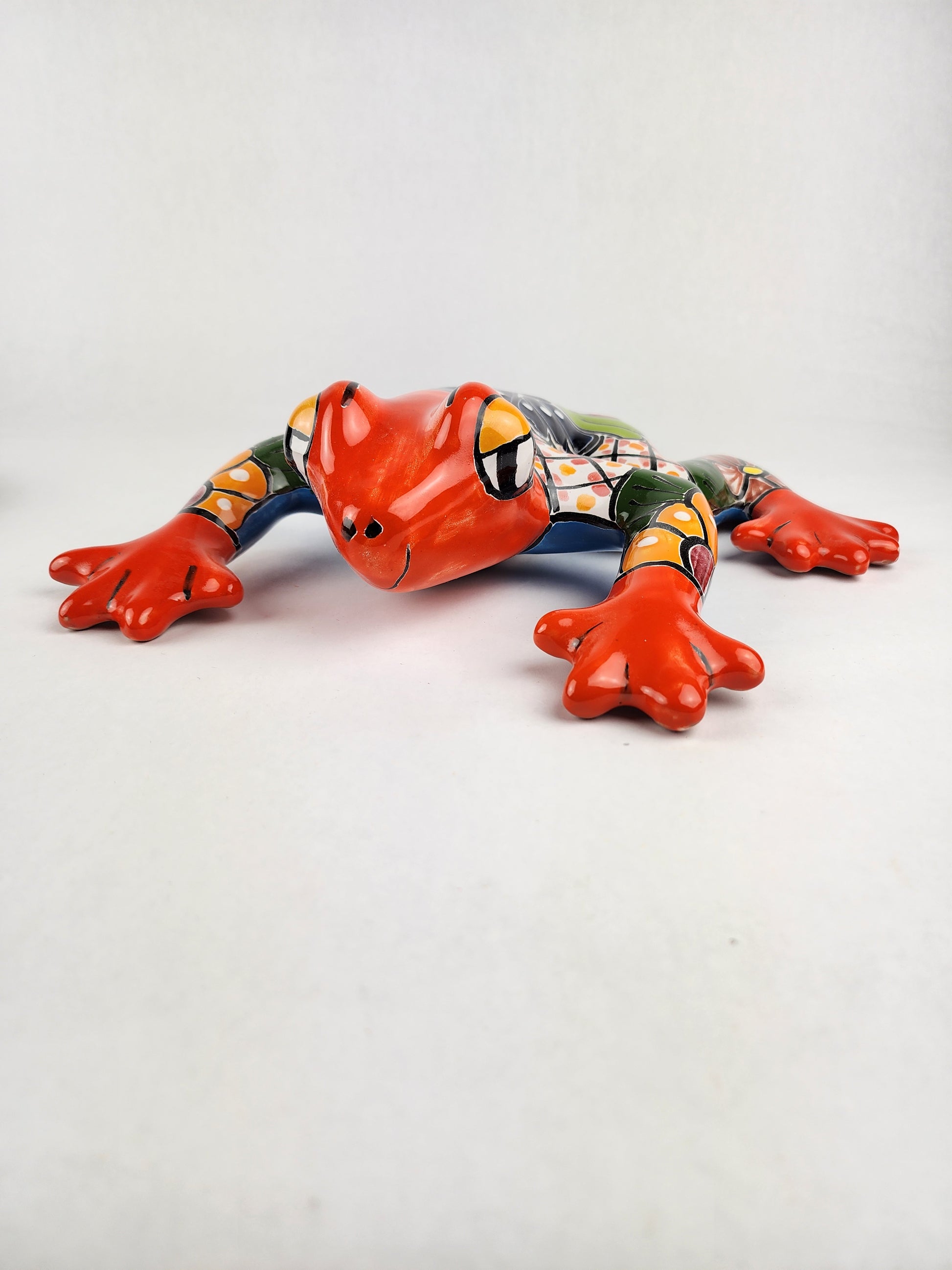 Elevate your décor with this vivid orange ceramic frog, hand-painted in the traditional Talavera folk art style. Its expressive form, paired with intricate brushwork and bright contrasting colors, makes it a true conversation starter.
