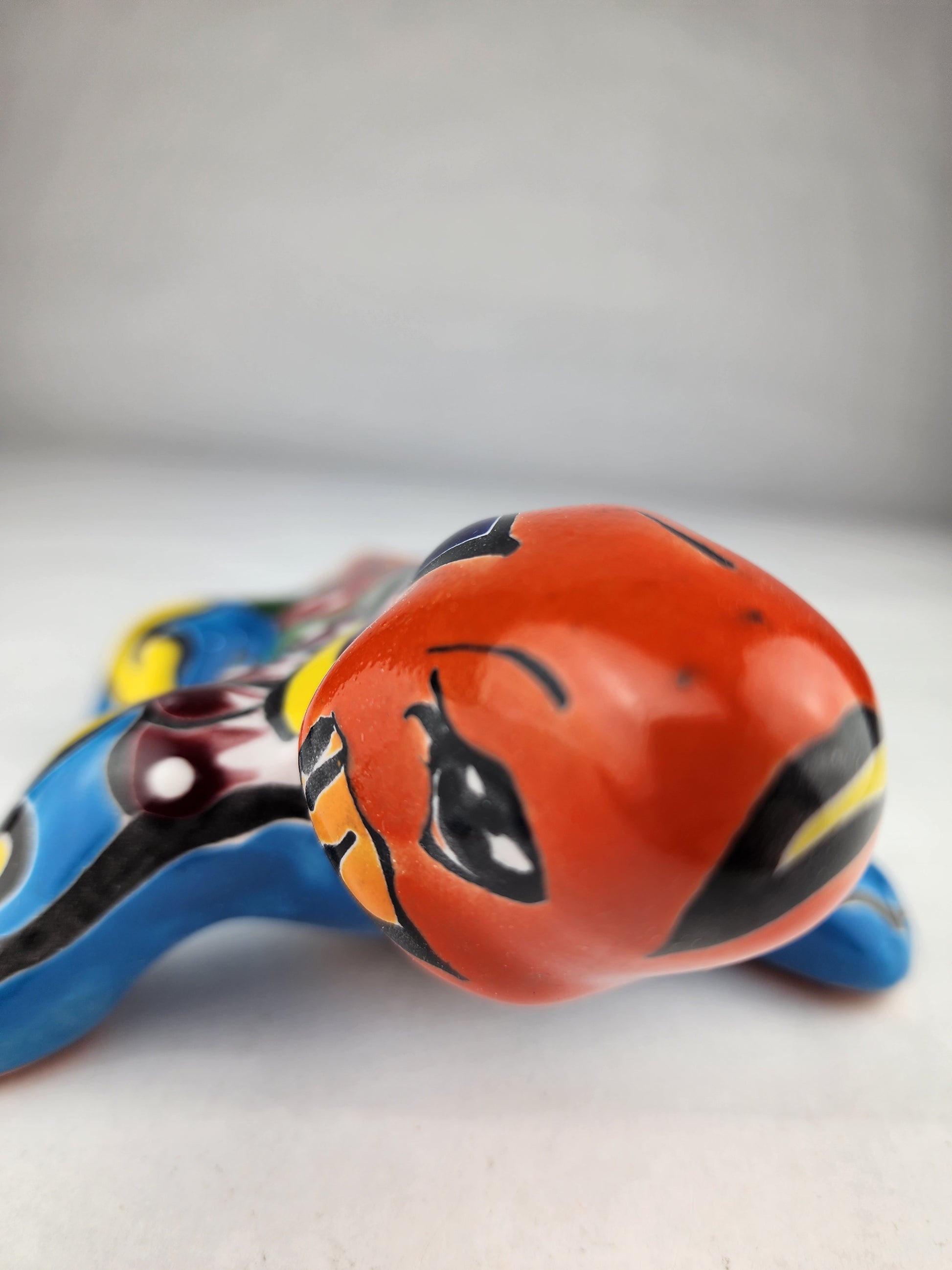 Calm yet visually engaging, this sky blue and orange Talavera-style ceramic iguana brings balance and color to its surroundings. Its elongated form and relaxed posture create a natural presence that feels decorative without being overpowering.