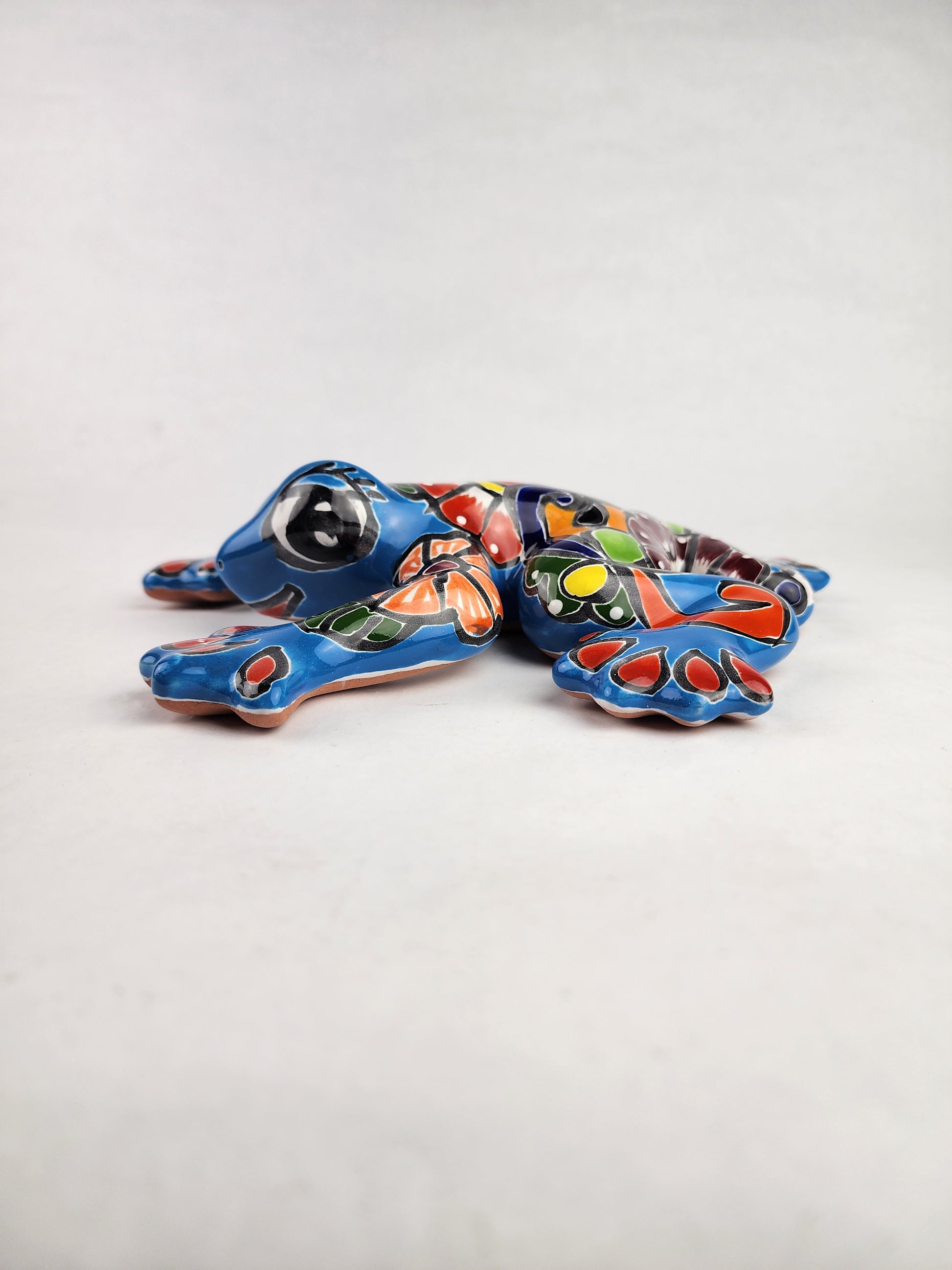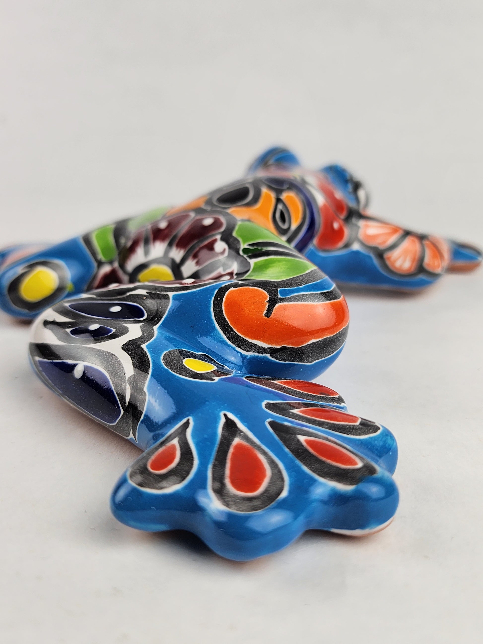 Each frog is handcrafted and hand-painted by artisan families in Mexico, featuring traditional Talavera-style patterning layered over a glossy ceramic finish. The sky blue color palette is complemented by hand-applied details that give the piece depth, personality, and visual balance.