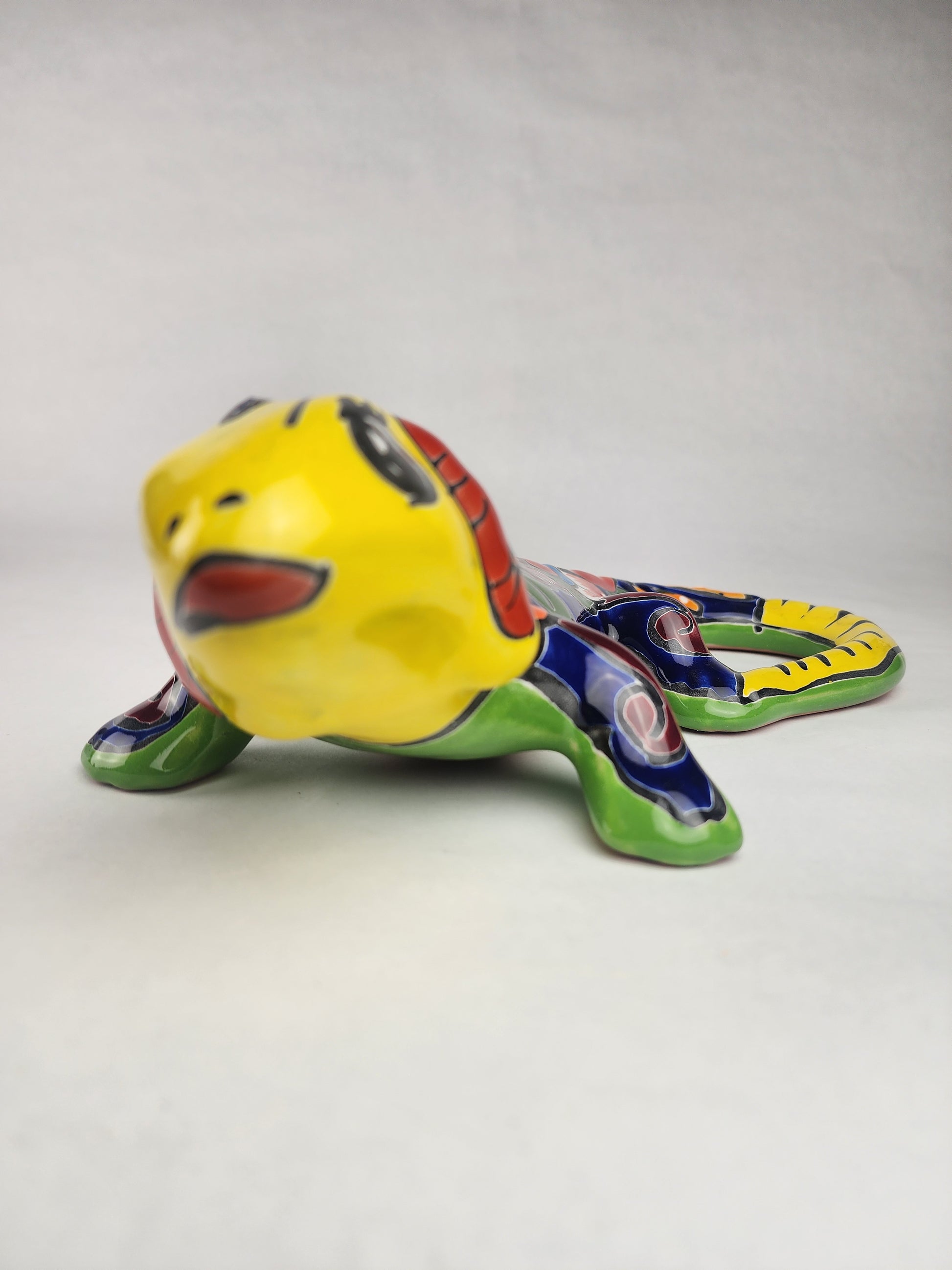 A radiant yellow Talavera-style iguana with colorful hand-painted patterns — handcrafted in Mexico by talented artisans.